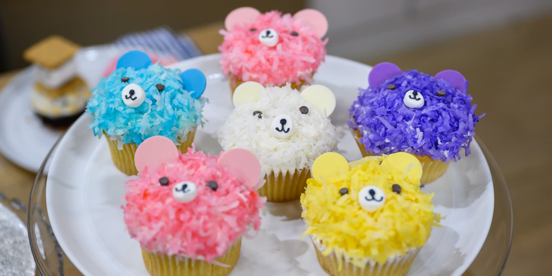 Humorous woman wearing silly glasses holding huge cake